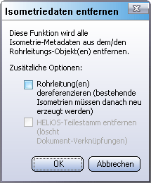 Optional können mit dieser Funktion auch Rohrleitungs-Referenzierungen rückgängig gemacht (hierbei werden die .KRA-Dateien und der Teile-Dokustamm gelöscht) sowie die gesamten erzeugten HELiOS-Stammdaten entfernt werden. Wird der Teilestamm gelöscht, geht hierbei die Verknüpfung bereits existierender Isometrien bzw. eventueller weiterer Dokumente verloren, weshalb in diesem Fall angeboten wird, die betroffenen Dokumente aufzulisten. Diese Nachfrage ist identisch zu der beim Löschen von referenzierten Leitungen.