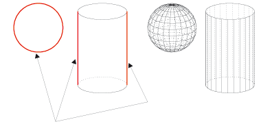 Die linke Abbildung zeigt das analytische Model einer Kugel und eines Zylinders. Die roten Kanten sind scheinbare Kanten. Die rechte Abbildung zeigt das entsprechende Polyedermodell.