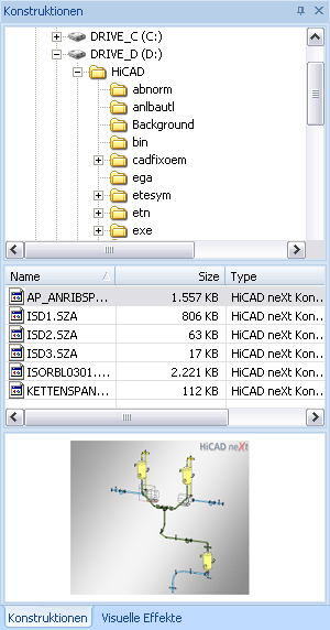 Das Andockfenster Konstruktion ermöglicht ein schnelleres Öffnen von HiCAD-Konstruktionen (.SZA). Wählen Sie einfach den entsprechenden Ordner aus und doppelklicken Sie auf den gewünschten Dateinamen.