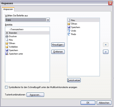 Um einen Befehl hinzuzufügen, wählen Sie links das Menü und den entsprechenden Befehl aus. Klicken Sie auf die Schaltfläche Hinzufügen>, um den Befehl in das rechte Fenster zu übertragen. Wollen Sie einen Befehl aus der Schnellzugriffsleiste entfernen, dann wählen Sie ihn rechts im Fenster aus und klicken Sie auf die Schaltfläche Entfernen. Mit den Schaltflächen und können Sie die Reihenfolge der Befehle innerhalb der Schnellzugriffsleiste ändern.