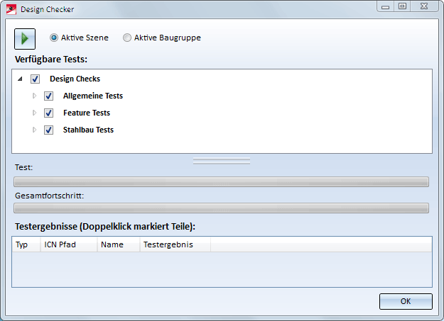 Geprüft wird die aktive Szene oder die Baugruppe. Dazu aktivieren Sie einfach die gewünschte Option. Solange das Dialogfenster geöffnet ist, können Sie die Baugruppe, die geprüft werden soll, beliebig wechseln.