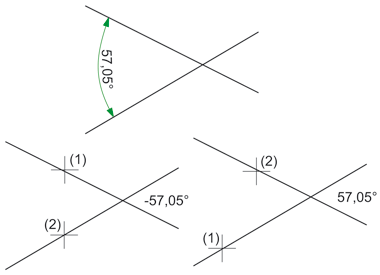 Information, Winkel 2 Linien (2D) Ermittelt den Winkel zwischen Linienelementen. Der ermittelte Winkel hängt von der Cursorstellung beim Identifizieren der beiden Linien ab. |