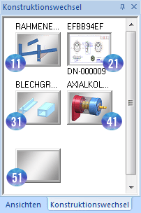 In HiCAD können Sie bis zu 18 Konstruktionen gleichzeitig öffnen und bearbeiten. Miniaturansichten dieser Konstruktionen werden in der Registerkarte Konstruktionswechsel des ICN dargestellt. Von den ersten 9 Konstruktionen wird dabei nach einem gewissen Zeitintervall automatisch eine Datensicherung für die Zeichnung durchgeführt, an der Sie gerade arbeiten. Dieses Zeitintervall ist iSD-seitig auf 10 Min. voreingestellt.