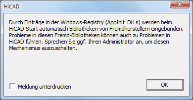 Soll diese Meldung bei künftigen HiCAD-Starts nicht mehr angezeigt werden, dann kann die Checkbox Meldung unterdrücken aktiviert werden. Sprechen Sie dazu ggf. Ihren Administrator an. Die Meldung erscheint dann erst wieder, wenn sich der Registry-Wert geändert hat, also andere DLL-Dateien geladen werden!