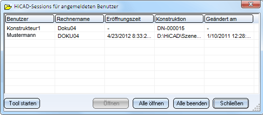 Bei einem solchen Systemabsturz werden die Lock-Files der beim Absturz geöffneten Konstruktionen nicht entfernt, d.h. die Konstruktionen bleiben für andere Anwender gesperrt. Beim nächsten HiCAD-Start werden Ihnen diese gesperrten Dateien in Dialogfenster HiCAD Sessions... angezeigt.
