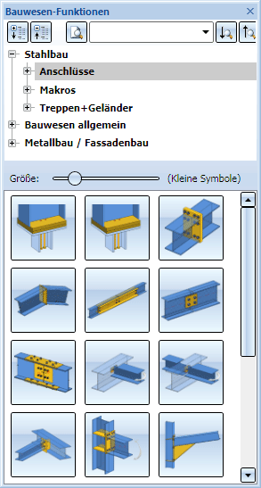 Im Stahl- und Metallbau können Sie über dieses Andockfenster Anschlüsse, Verbindungselemente, Treppen und Geländer sowie weitere Objekte in die Konstruktion einbauen.