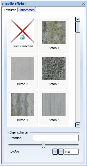 Über dieses Fenster können Sie 3D-Teilen Texturen zuweisen. Darüber hinaus haben Sie über die Registerkarte Panoramen die Möglichkeit, dem Blatt- oder Modellbereich Ihrer Konstruktion ein Panorama zuzuweisen, das als Hintergrund dargestellt wird.