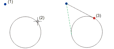 Ausgehend von der aktuellen Cursorposition wird hier der nächstgelegene tangentiale Berührungspunkt einer Strecke mit einem Kreis, einer Ellipse oder einem Bogen bestimmt. Die Strecke wird dabei bestimmt durch die aktuelle Cursorposition und den letzten Punkt.