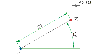 Der Punkt wird durch Eingabe des Winkels mit der positiven X-Achse und einer Distanz bestimmt. Diese wird vom letzten Punkt unter Berücksichtigung des Winkels angetragen. Geben Sie den Winkel und die Distanz durch ein Leerzeichen getrennt an z.B. 30 50.