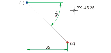 HIer wird der Punkt wird durch Angabe des Winkels zur positiven X-Achse und der X- bzw. Y-Distanz bestimmt. Wie bei der Option P können Sie auch hier einen anderen Bezugspunkt wählen und Werte aus der Zeichnung übernehmen.