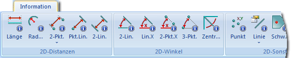 Die Funktionen der Registerkarte Information liefern Ihnen detaillierte Informationen über 2D- und 3D-Geomtrieelemente und Teile. Darüber hinaus können Sie Berechnungen für die verschiedensten Konstruktionsobjekte durchführen, beispielsweise Winkel- und Abstandsberechnungen, Kollisionsprüfungen, Gleichteilerkennungen sowie Flächen- und Volumenberechnungen.
