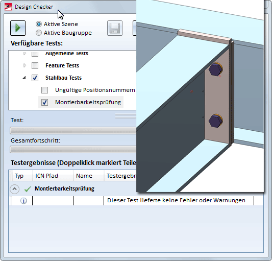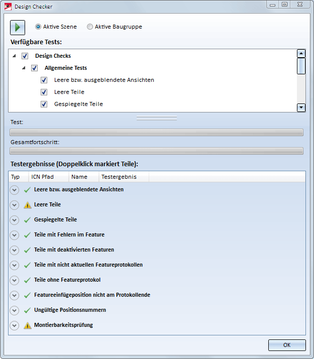 Geprüft wird die aktive Szene oder die Baugruppe. Dazu aktivieren Sie einfach die gewünschte Option. Solange das Dialogfenster geöffnet ist, können Sie die Baugruppe, die geprüft werden soll, beliebig wechseln.