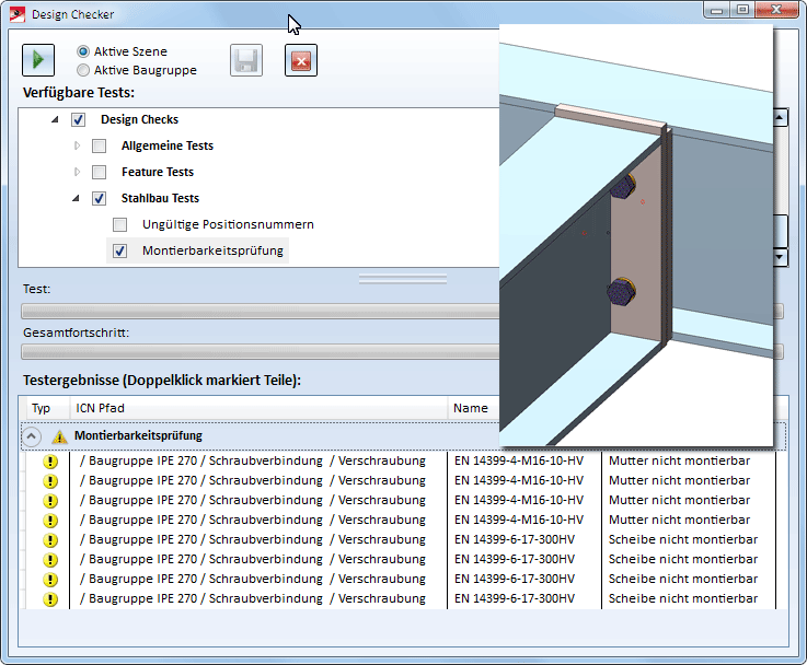 Durch einen Doppelklick auf einen Eintrag des Testergebnisses, wird das entsprechende Teil sowohl in der Konstruktion als auch im ICN markiert.