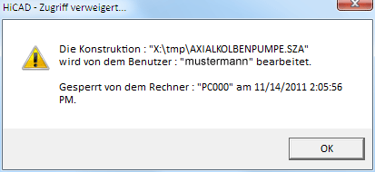 Das Fenster HiCAD - Zugriff verweigert wird angezeigt. Beim Klick auf OK wird die Konstruktion geladen.