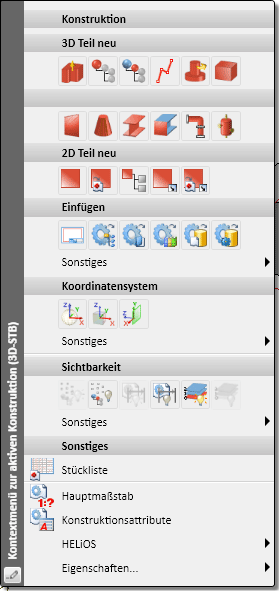 Wenn Sie mit der rechten Maustaste auf einen leeren Bereich der HiCAD-Zeichenfläche oder auf den Konstruktionsnamen im iCN klicken, wird das Kontextmenü der Konstruktion aktiviert. Hier haben Sie schnellen und direkten Zugriff auf Funktionen folgender Bereiche: