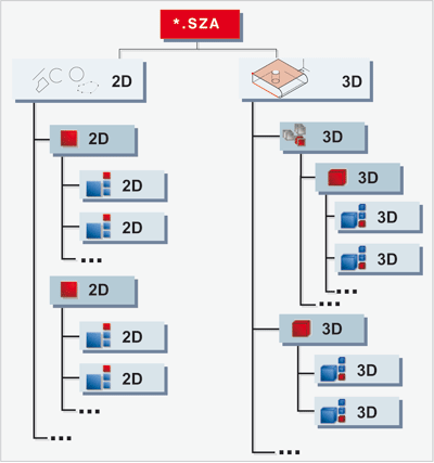Eine HiCAD-Konstruktion kann 2D- und 3D-Teile enthalten, die ihrerseits aus 2D-Linienelementen und 3D-Geometrieelementen bestehen. Jedes dieser Teile kann ein Hauptteil oder ein Nebenteil, d.h. ein einem Hauptteil untergeordnetes Teil, sein. Zur weiteren Strukturierung der Konstruktion werden Baugruppen verwendet. Wie die Konstruktion erhalten auch Baugruppen und Teile, einen Namen, über den sie gefunden und aktiviert werden können.