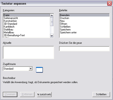Um einem Befehl eine Tastenkombination zuzuordnen, wählen Sie die Kategorie und den Befehl aus. Setzen Sie dann den Cursor in das Feld Drücken Sie die neue... und geben Sie auf der Tastatur die gewünschte Tastenkombination ein.