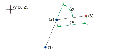 Im Unterschied zur Option Absoluter Winkel und X-Distanz bezieht sich der Winkel nicht auf die X-Achse des Koordinatensystems, sondern auf die Gerade durch den letzten und den vorletzten Punkt. Ist ein letzter und ein vorletzter Punkt nicht verfügbar, wird die Bestimmung einer Bezugslinie angefordert.