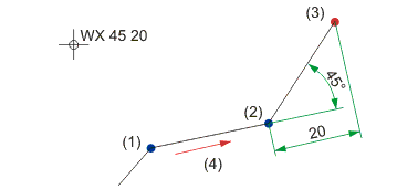 Im Unterschied zur Option Absoluter Winkel und Distanz bezieht sich der Winkel nicht auf die X-Achse des Koordinatensystems, sondern auf die Strecke durch den letzten und den vorletzten Punkt. Ist ein letzter und ein vorletzter Punkt nicht verfügbar, wird die Bestimmung einer Bezugslinie angefordert.