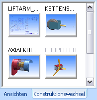 Maximal 18 Konstruktionen lassen sich in HiCAD gleichzeitig laden und bearbeiten. Das parallele Öffnen mehrerer Konstruktionen und der Wechsel zwischen den Dateien erfolgt über die ICN-Registerkarte Konstruktionswechsel. Diese Registerkarte enthält die Miniaturbilder und Dateinamen aller geladenen Konstruktionen. Beim Arbeiten mit HELiOS wird zusätzlich die Zeichnungsnummer angezeigt. Der Name der aktiven Konstruktion wird in einer anderen Farbe dargestellt.
