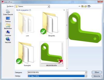 Im WindowsExplorer, im HiCAD Viewer, beim Einfügen von Teilen in HiCAD über den Explorer sowie in den Vorschaufenstern in HELiOS werden KRA-Dateien (3D-Teile) jetzt als Thumbnails, d.h. als schattierte Vorschaubbilder, dargestellt. (SP1)
