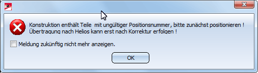 Vor dem Speichern müssen die Bauteile und Baugruppen positioniert werden. Enthält die Konstruktion beim Aufruf der Speicherfunktion nicht positionierte Teile oder Teile mit ungültiger Positionsnummer, dann erfolgt eine entsprechende Meldung.