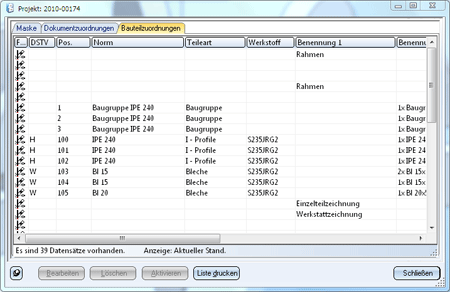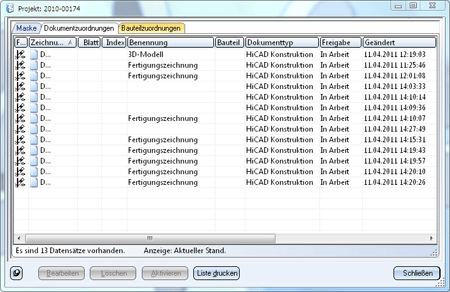 Darüber hinaus geben die Registerkarten Dokument- und Bauteilzuordnungen Auskunft über die mit dem aktiven Projekt verknüpften Dokumente ( z.B. Konstruktion und Fertigungszeichnungen) und Bauteile (Baugruppen, Profile, Bleche etc.).