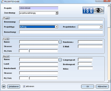 Diese Funktion wählen Sie, um ein neues Projekt anzulegen. Dazu wird das Dialogfenster Projekteingabe angezeigt. Bestimmen Sie zunächst den Projektnamen und geben Sie die gewünschten Projektdaten ein.