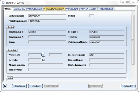 Teilestamm Aktiven Teilestamm für aktive Konstruktion anzeigen Mit dieser Funktion können Sie sich die Teilestammdaten der aktiven Konstruktion anzeigen lassen und diese Daten bearbeiten. Dazu wird das Dialogfenster Bauteil angezeigt.Über die Registerkarten können Sie sich darüber hinaus die Verwendungsnachweise, die Produktstruktur, die verknüpften Dokumente u.a.m. anzeigen lassen. |
