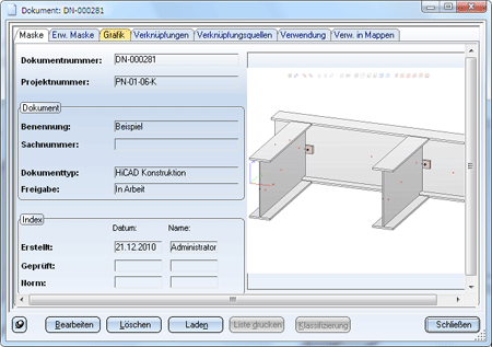 Dokumentstamm Dokumentstamm für aktive Konstruktion Hier werden - falls vorhanden - die Dokumentstammdaten der aktiven Konstruktion im Dialogfenster Dokument angezeigt. Das Fenster besteht aus mehreren Registerkarten. Neben Schaltflächen häufig verwendeter Funktionen, wie Bearbeiten oder Löschen finden Sie in den Kontext-Menüs (rechte Maustaste) der Detailfenster und Registerkarten zahlreiche weitere Bearbeitungsfunktionen. |