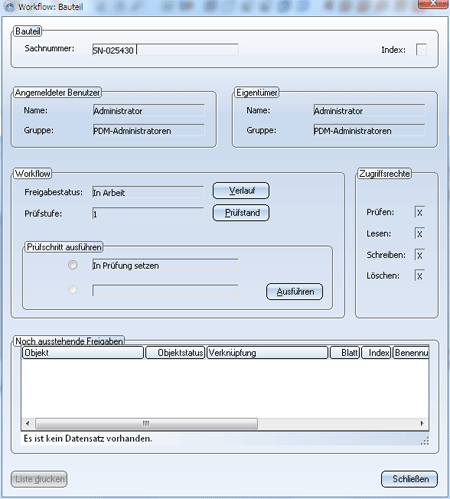 Workflow Freigabe Diese Funktion liefert workflowbezogene Informationen zur aktiven Konstruktion, wie z.B. den aktuellen Freigabestatus oder die Zugriffsrechte. Außerdem kann der Workflow als Grafik angezeigt und die unter Verlauf aufgerufene Listenansicht der Workflow-Vorgänge ausgedruckt werden. Die Schaltfläche Prüfstand öffnet den in der HELiOS-Konfiguration definierten Workflow. Der aktive Status ist rot umrandet und kann per Mausklick im folgenden Fenster geändert werfen. Handelt es sich um einen Rollen Workflow, werden zwei zusätzliche Schaltflächen angezeigt: