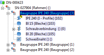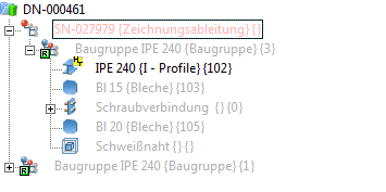 Bei der Zeichnungsableitung mit der Stahlbau Suite Zeichnungsverwaltung wird der Parameater BEDINGUNG FÜR 'ZEICHNUNG IST AKTUELL' aus dem Konfigurationsmanagement ausgewertet. Dieser Parameter bestimmt, wann bei der Zeichnungsableitung die Verknüpfung "Zeichnung ist aktuell" gesetzt wird. Weitere Informationen finden Sie im Abschnitt Einstellungen im Konfigurationsmanagement. Im nachfolgenden Beispiel ist der Parameter BEDINGUNG FÜR 'ZEICHNUNG IST AKTUELL' auf 0 gesetzt worden. Dies ist die Defaulteinstellung. Das bedeutet: Ist die Baugruppe detailliert, dann erhalten auch die Haupt- und Nebenteile die Verknüpfung "Zeichnung aktuell". |
