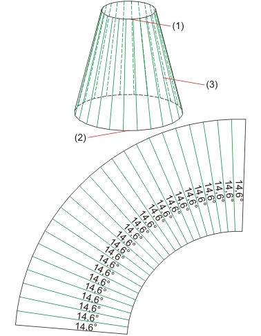 Diese Funktion wickelt die Oberfläche eines 3D-Teils (z.B. Kegelstumpf oder Freiformfläche) analytisch ab. Dabei wird immer eine Blechdicke (Offset) für die Schnitttiefe abgefragt. Bei gerundeten Flächen ergeben sich dadurch Änderungen im Flächeninhalt der Abwicklung.