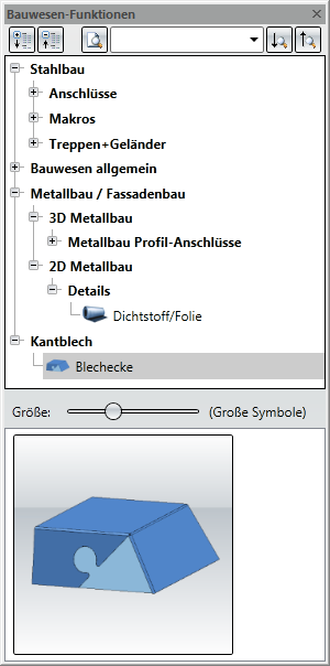 Der Einbau von Designvarianten im Blech erfolgt über das Andockfenster Bauwesen-Funktionen.