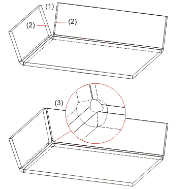 Diese Funktion schließt offene Ecken, die beim Ankanten von Blechlaschen entstehen. Dabei wird die Biegezone mit einem Freischnitt versehen.