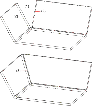 Bei der Funktion Ecke schließen werden die Bleche bis zum gemeinsamen Schnittpunkt der inneren Kante verlängert oder ggf. verkürzt. Haben Sie die Funktion Ecke schließe, Biegekante zu gewählt, dann wird auch die Biegezone geschlossen.