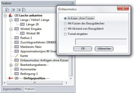 Sie haben die Wahl zwischen: anfügen ohne Kürzen, mit Kürzen des Bezugsbleches und mit Abstand zum Bezugsblech.