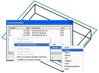 Die Variablen des Designvariantenbasiskörpers werden zu den Parametern der Designvariante. D.h. diese Variablen werden beim Einbau der Variante abgefragt. Wenn die Variablen einen Kommentar haben, wird dieser statt des Variablennamens bei der Abfrage angezeigt.