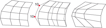 Links: Ausgangsfläche, Mitte: Gewichtsänderung an den rot markierten Knoten, Rechts: Geänderte Fläche