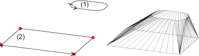 Sind die beiden zu verbindenden Kurven Kantenzüge mit einer unterschiedlichen Anzahl von Kanten, dann versucht HiCAD zunächst in den Kantenzug mit der kleineren Kantenzahl sogenannte Nullkanten einzufügen, um die Kantenzahl der beiden Kantenzüge anzugleichen. Nullkanten sind zu einem Punkt "entartete" Strecken. Die durch die Nullkanten entstehenden Flächen sind optisch nur noch durch 3 Kanten begrenzt. HiCAD zeigt anschließend das entsprechende Gerüst an. Wollen Sie dieses zur Freiformflächengenerierung übernehmen, dann wählen Sie OK. Wenn nicht, drücken Sie auf Nein. In diesem Fall werden weitere von HiCAD automatisch bestimmte Vorschläge angezeigt. Sind keine weiteren Vorschläge vorhanden, dann fordert HiCAD Sie auf, die Nullkanten selber zu bestimmen oder ein Verfahren zur Nullkantenbestimmung auszuwählen.