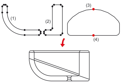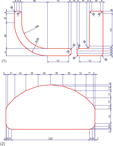 Die nachfolgende Abbildung enthält den Querschnitt eines Beckens, der an den beiden abgebildeten, geschlossenen Leitlinien verlegt werden soll. Die beiden 3D-Leitlinien und der 2D-Querschnitt wurden mit den angegebenen Maßen als Kantenzüge erzeugt.