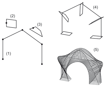 (1) Leitlinie, (2,3) Verschiedene Querschnitte, (4) Gerüst mit Querschnitt 1 und Querschnitt 2, (5) Freiformfläche