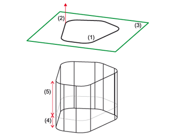 (1) 3D-Skizze, (2) Verschiebevektor, (3) Skizzenebene, (4) Starthöhe, (5) Endhöhe
