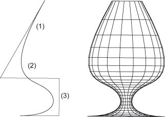 (1) Originalkantenzug, (2) B-Spline, (3) Rotationsachse