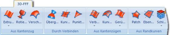 Die Funktionen zur Generierung und Bearbeitung von Freiformflächen finden Sie auf der Registerkarte 3D-FFF der Multifunktionsleiste.