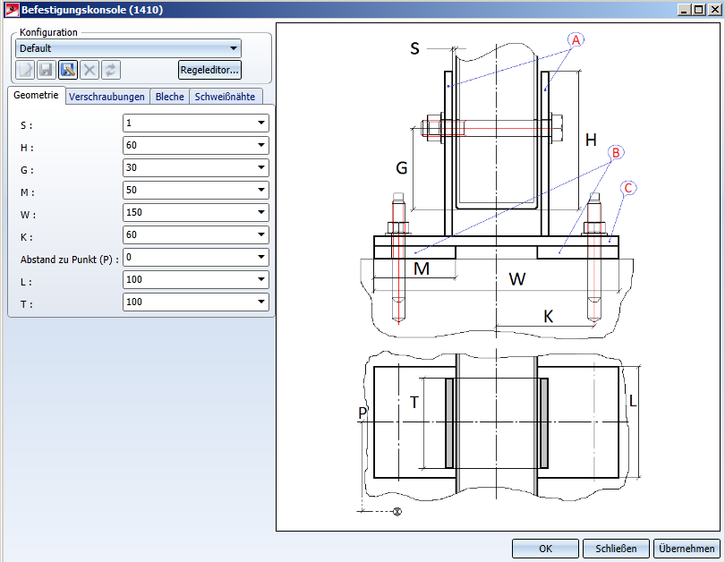 Im Geometrie-Reiter des Dialogs können Sie links die Werte zu den Abstandslängen vergeben, die rechts mit den entsprechenden Buchstaben in der Grafik der Variante gekennzeichnet sind.