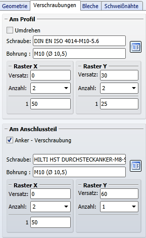 In der Registrierkarte Verschraubungen können Sie dann die genauen Angaben für die jeweiligen Verschraubungen Am Profil und Am Anschlussteil vornehmen.