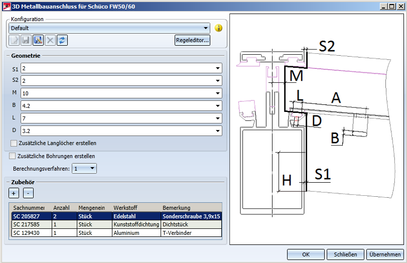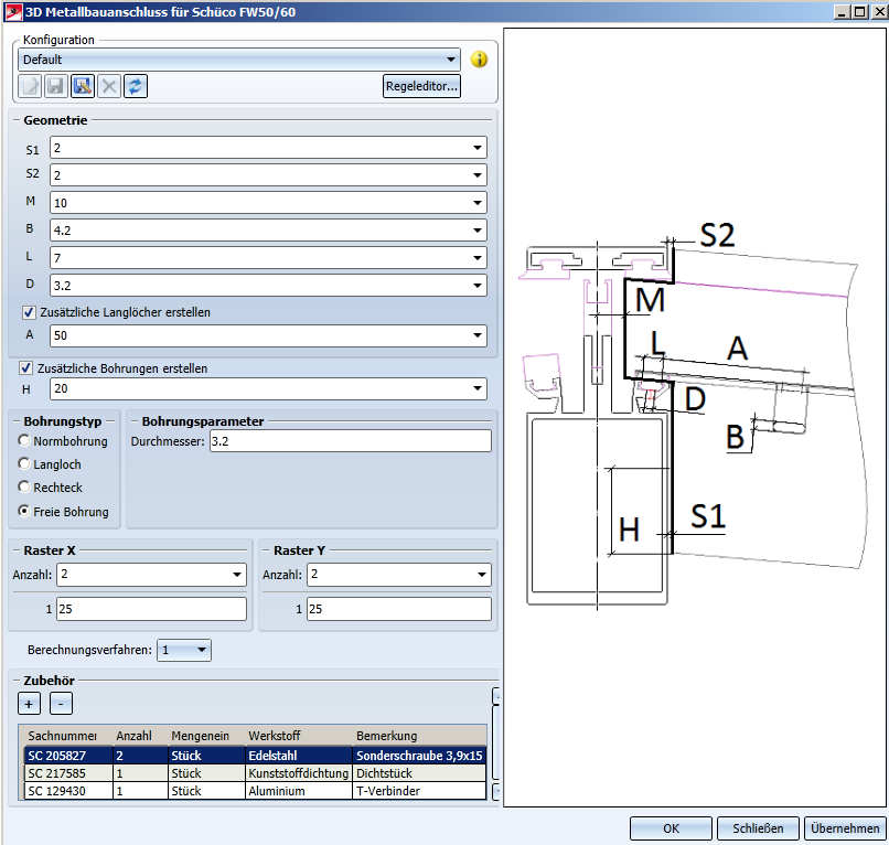 Dort finden Sie auch einen vordefinierten Pfosten-Riegelanschluss. Hierbei handelt es sich um einen variabel einsetzbaren 3D Metallbauanschluss für Schüco FW50/60.
