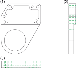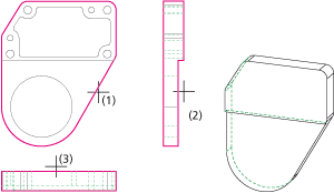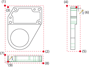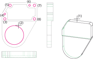 Sie das 3D-Modell (1) und dann die Lochkonturen (2) bis (8) in der Vorderansicht.