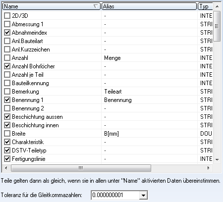 Teile gelten dann als gleich, wenn Sie in allen Daten übereinstimmen, die in der Spalte "Name" aktiviert sind. Zur Aktivierung/Deaktivierung eines Namens klicken Sie das Kontrollkästchen vor dem Namen an.